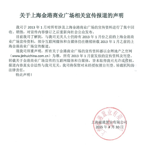 關(guān)于上海金港商業(yè)廣場(chǎng)相關(guān)宣傳報(bào)道的聲明